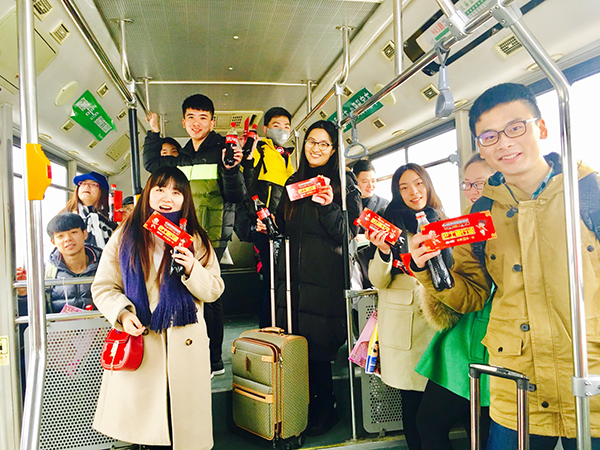 2017年1月13日“春運(yùn)大潮”正式開(kāi)始,第一波主流人群就是學(xué)生,除了搶車(chē)票,擠候車(chē)廳,還有前奏就是擠公交,搶出租車(chē)去車(chē)站。為了讓同學(xué)們更順利的回家,可口可樂(lè)在鄭州5所高校打造了愛(ài)心專列巴士,持續(xù)5天往返于車(chē)站和學(xué)校之間,助力按時(shí)抵達(dá)。“還有什么比回家更開(kāi)心的嗎?還有什么比,邊喝可口可樂(lè)邊看別人擠公交車(chē)更開(kāi)心的嗎?愛(ài)心巴士好贊,讓我們的歸家路無(wú)比快樂(lè)和暖心!” 河南輕工業(yè)大學(xué)大三耿嘉尉同學(xué)高興的說(shuō)著。