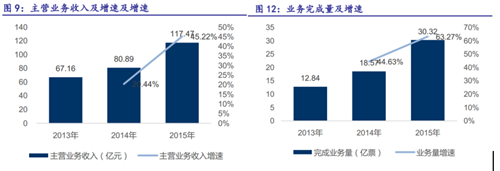注: 因?yàn)轫権S在最新年報(bào)中沒有給出詳細(xì)的國內(nèi)快遞業(yè)務(wù)(時(shí)效產(chǎn)品)的件量數(shù)量。只給了一個(gè)總體25.8億票和31%的增速,前后口徑應(yīng)不同,所以2016年份額反增加。但不影響結(jié)論。若按2015年占比為8.22%,若16年件量增速31% ,份額實(shí)際已降至1.31/1.5*8.22%=7.1%左右。