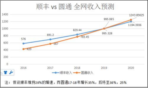 順豐全網(wǎng)收入份額一度達(dá)20%。但隨著增速落后逐年下滑,很可能要失去老大地位。圓通申通單票運(yùn)費(fèi)是順豐的1/2,只要件量是順豐的2倍。就有可能超過順豐。2016年2月圓通老板娘張小娟在杭州兩會(huì)上透露圓通2015年總件量約35億件(實(shí)際30億票),全網(wǎng)營收350億元(實(shí)際可能為300億元)。根據(jù)圓通發(fā)布的業(yè)績預(yù)告,2016年件量和收入都大于40%的增長。全網(wǎng)收入可能超420億元。假若保持這種趨勢(shì)下去,圓通甚至中通、申通等都可能在接下來三五年內(nèi)在全網(wǎng)收入上超越順豐, 甚至比順豐提早突破千億大關(guān)。順豐可能掉至三四名甚至更后。