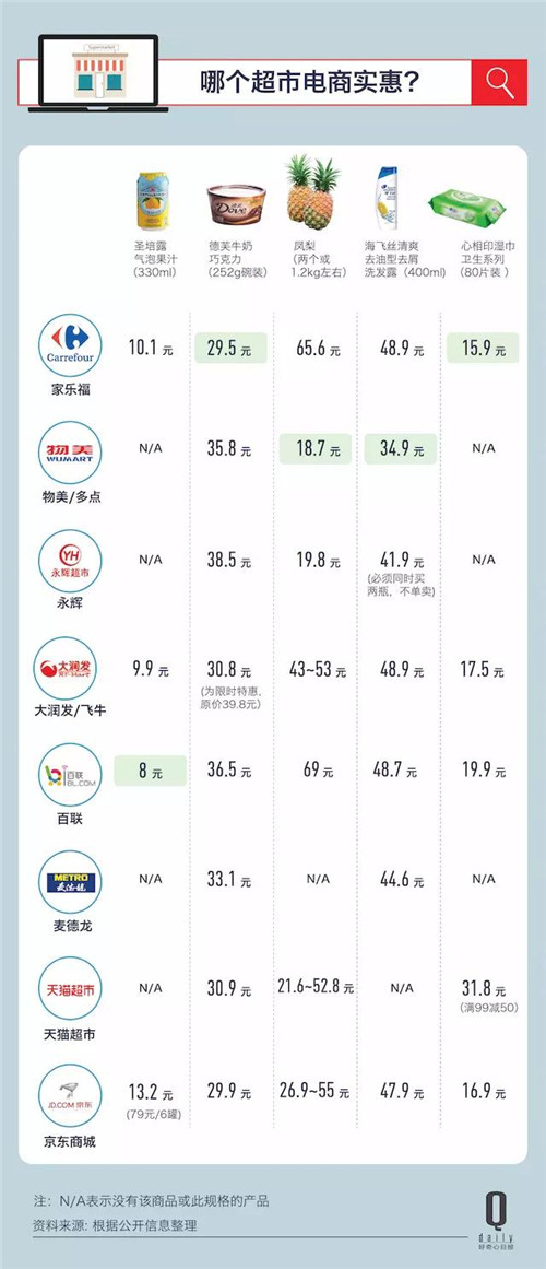從包裝食品、進口食品、生鮮到日化產(chǎn)品,我們隨機選擇了五個產(chǎn)品比較了一下價格。天貓超市和京東的價格優(yōu)勢不是那么明顯了。天貓超市經(jīng)常會有提價再打折的情況(知乎有不少人也反映這種情況),比如心相印濕紙巾在天貓上雖然有滿 99 減 50 的折扣,但實際上它的原價就是這款產(chǎn)品最便宜的渠道——家樂福的兩倍。從隨機抽選的 5 個產(chǎn)品來看,家樂福和物美的價格比較吸引人。