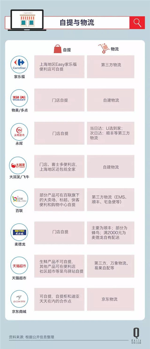 超市有線下門店這些據(jù)點優(yōu)勢,大部分超市電商都不會漏過自提的功能。除了網(wǎng)上家樂福只能在便利店“家樂福 Easy”提貨之外(你暫時還不能在家樂福超市門店提貨),其實都是希望把客流引向線下門店。大潤發(fā)/飛牛的自提點更多,除了大潤發(fā)還有同一母公司高鑫零售旗下的喜士多,在上海它還和全家便利店建立合作,消費者也可以在那里自提。