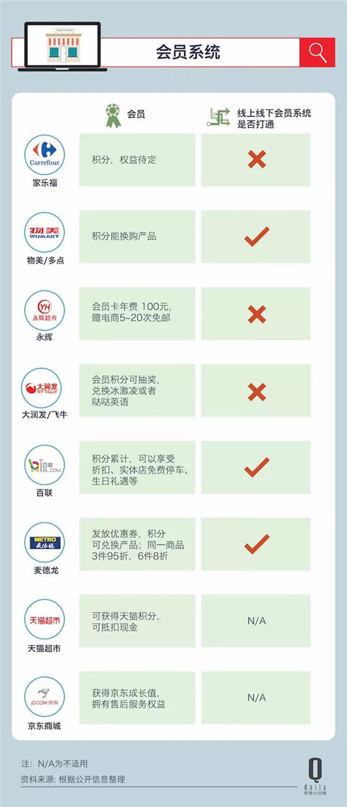 另外永輝、家樂福以及飛牛網(wǎng)(網(wǎng)上大潤發(fā))的線上線下會員體系都沒有打通。如果是打算做客群來留住消費者,打通會員體系還是比較重要的。