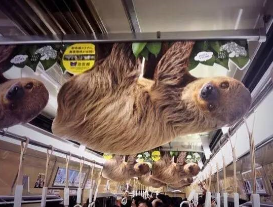 先看看這組:大阪水族館海游館的車(chē)廂廣告,實(shí)物大的樹(shù)懶(2014)。