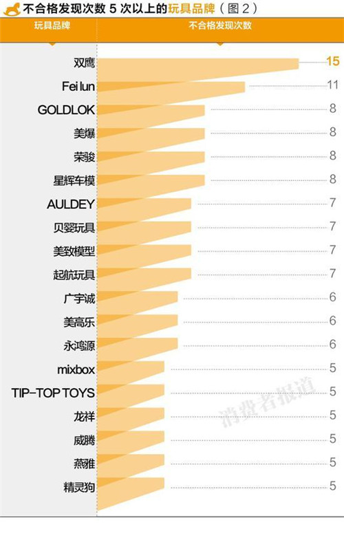 雙鷹與飛輪的不合格次數(shù)超過(guò)10次,而美高樂(lè)、星輝車模等較知名品牌也數(shù)次登上黑榜。兒童玩具的抽檢不合格項(xiàng)目主要集中在標(biāo)志與危險(xiǎn)警示不規(guī)范、以及小零件、尖端傷害等方面。