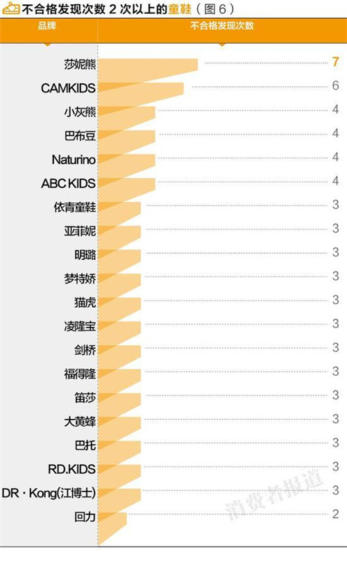 抽檢數(shù)據(jù)顯示,上海童鞋品牌莎妮熊的的不合格次數(shù)最高,而童鞋抽檢不合格的,回力也有兩次出現(xiàn)不合格。主要問(wèn)題集中在強(qiáng)度硬度、標(biāo)識(shí)、感官質(zhì)量、高度(長(zhǎng)度)誤差等方面。