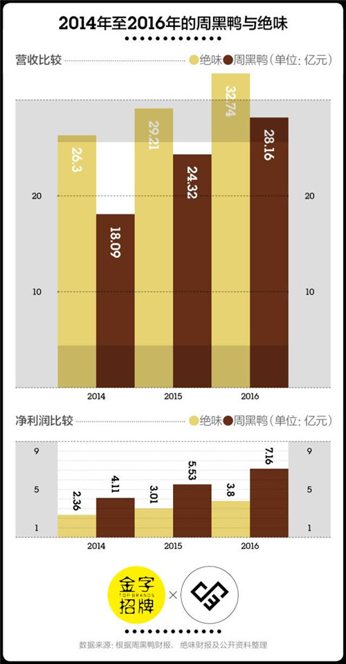 近兩年的市場(chǎng)表現(xiàn)沒有讓潘攀失望。根據(jù)咨詢公司弗諾斯特沙利文的數(shù)據(jù),中國休閑鹵制品零售總額從2010年的232億元增長(zhǎng)至2016年的637億元,年均復(fù)合增長(zhǎng)率為18.5%。截至2016年12月31日,周黑鴨全年?duì)I收約為28.16億元,較去年同期的24.32億元增長(zhǎng)15.8%。雖然778家的門店數(shù)量只有絕味的1/10左右,但周黑鴨的利潤率是絕味的2倍多。