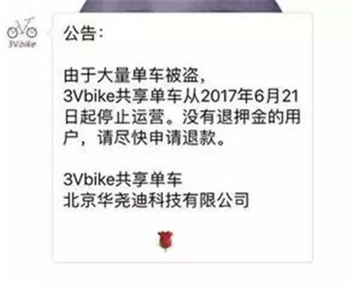 6月21日,共享單車(chē)平臺(tái)3Vbike對(duì)外宣布稱,由于單車(chē)大量被盜,即日起停止運(yùn)營(yíng)。并提醒沒(méi)有退押金的用戶盡快申請(qǐng)退款。
