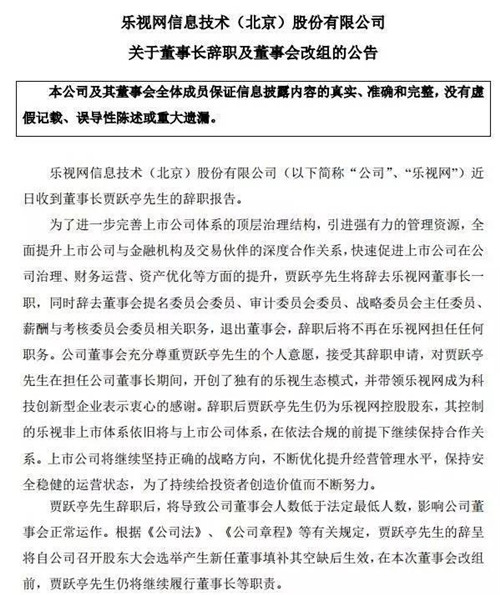 賈躍亭退出了在樂視網(wǎng)的任職,孫宏斌則將進(jìn)入董事會(huì)。