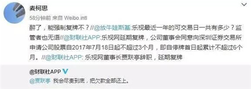 另外,關(guān)于樂視網(wǎng)股票復(fù)牌的事情,公告也一并做了回復(fù):公司董事會(huì)同意向深圳證券交易所申請(qǐng)公司股票自2017年7月18日起不超過(guò)3個(gè)月,即自停牌首日起累計(jì)不超過(guò)6個(gè)月。