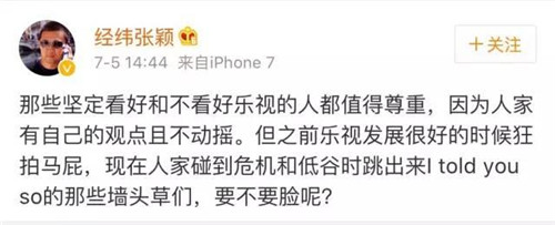 那些堅(jiān)定看好和不看好樂視的人都值得尊重,因?yàn)槿思矣凶约旱挠^點(diǎn)且不動(dòng)搖。但之前樂視發(fā)展很好的時(shí)候狂拍馬屁,現(xiàn)在人家碰到危機(jī)和低谷時(shí)跳出來(lái)I told you so的那些墻頭草們,要不要臉呢?