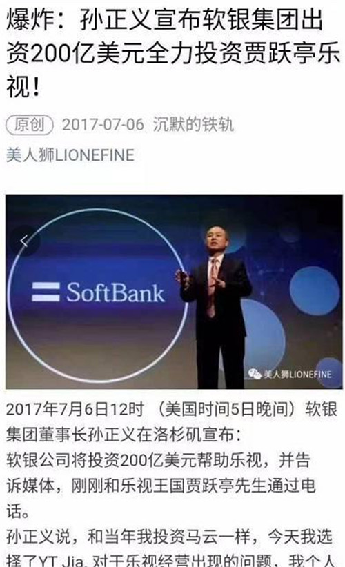 凡是相信“孫正義投資樂視200億美元”的人智商都需要充值。第一,軟銀自己因?yàn)榫拶Y收購(gòu)ARM資金鏈都很緊,哪來(lái)這么多現(xiàn)金?第二,這個(gè)世界上沒任何互聯(lián)網(wǎng)公司能拿到單筆超過(guò)50億美元的投資。第三,文章那么多驚嘆號(hào)……孫正義表示這個(gè)鍋我不背!一看就是個(gè)憤憤蹭熱點(diǎn)的,不值得為這種垃圾信息浪費(fèi)時(shí)間