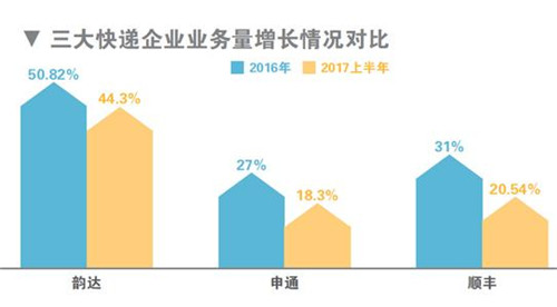 根據(jù)順豐發(fā)布的財(cái)報(bào)顯示,2017年上半年,順豐控股實(shí)現(xiàn)快件業(yè)務(wù)量13.73億件,同比增長(zhǎng)20.54%;2016年順豐快件業(yè)務(wù)量為25.8億件,同比增長(zhǎng)31%。而申通快遞2017年半年業(yè)務(wù)量為17.26億件,同比增長(zhǎng)18.3%;2016年業(yè)務(wù)量近32.6億件,同比增長(zhǎng)約27%。此外,韻達(dá)2017年上半年財(cái)報(bào)數(shù)據(jù)也顯示,業(yè)務(wù)量同比增長(zhǎng)44.28%;相比2016年公司業(yè)務(wù)量50.82%的增幅有所減緩。