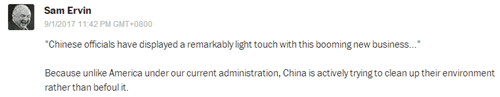 網(wǎng)友Sam Ervin:“‘中國官員對蓬勃發(fā)展的共享單車業(yè)務(wù)表現(xiàn)出柔性的監(jiān)管姿態(tài)?!绹灰粯?,中國正在積極地改善環(huán)境,而不是破壞環(huán)境。”