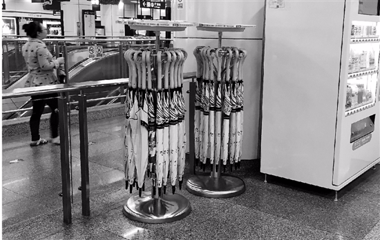 昨天,錢報(bào)記者來到地鐵武林廣場站,在地鐵刷卡入口處附近,就發(fā)現(xiàn)了兩個(gè)圓柱形的架子。架子上掛滿了各式各樣的長柄雨傘。架子上貼著提示語:掃碼借傘。