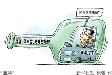 牌照、停車位、充電樁成為制約共享汽車行業(yè)發(fā)展的三大瓶頸,需要各方協(xié)同創(chuàng)新以促進(jìn)產(chǎn)業(yè)可持續(xù)發(fā)展。新華社發(fā) 徐駿/作