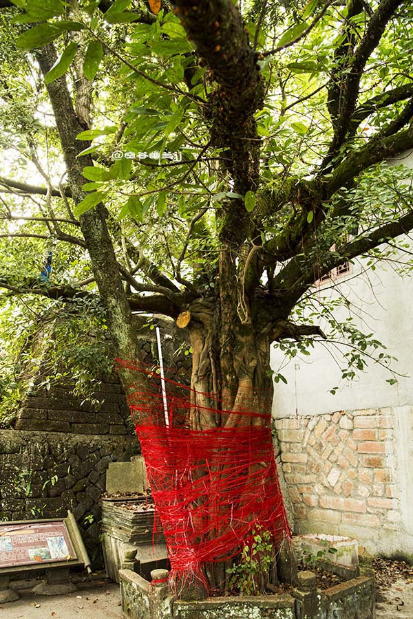 鴛鴦樹(shù)生長(zhǎng)在六祖堂舊址旁邊。遠(yuǎn)看,它婷婷玉立如一體,枝葉婆娑不分彼此;近看,則可辨清樹(shù)干一里一外,兩種不同科目的樹(shù)相互依存。一株四百多歲的百日青,一株一百多歲的筆管榕,它們的樹(shù)葉交錯(cuò),各現(xiàn)姿容,好象久別重逢的情侶,互相擁抱著站立在幽靜的山谷間。