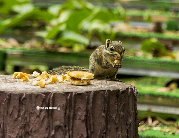 路遇可愛(ài)的小精靈,開(kāi)始它還有些害怕,后來(lái)放在樹(shù)樁上食物,它的膽子就大了起來(lái)。