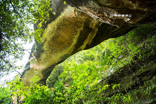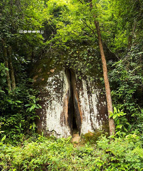 福音峽。這里懸崖相依,兩山并立,相距不過(guò)數(shù)尺,遠(yuǎn)觀之則只見(jiàn)藍(lán)天一線自峽中露出,故名“一線天”。右邊一石,形如草鞋。據(jù)說(shuō):人立在峽中,面向南大喊,若有四聲回音,則此人將有福緣,故此峽名“福音峽”。