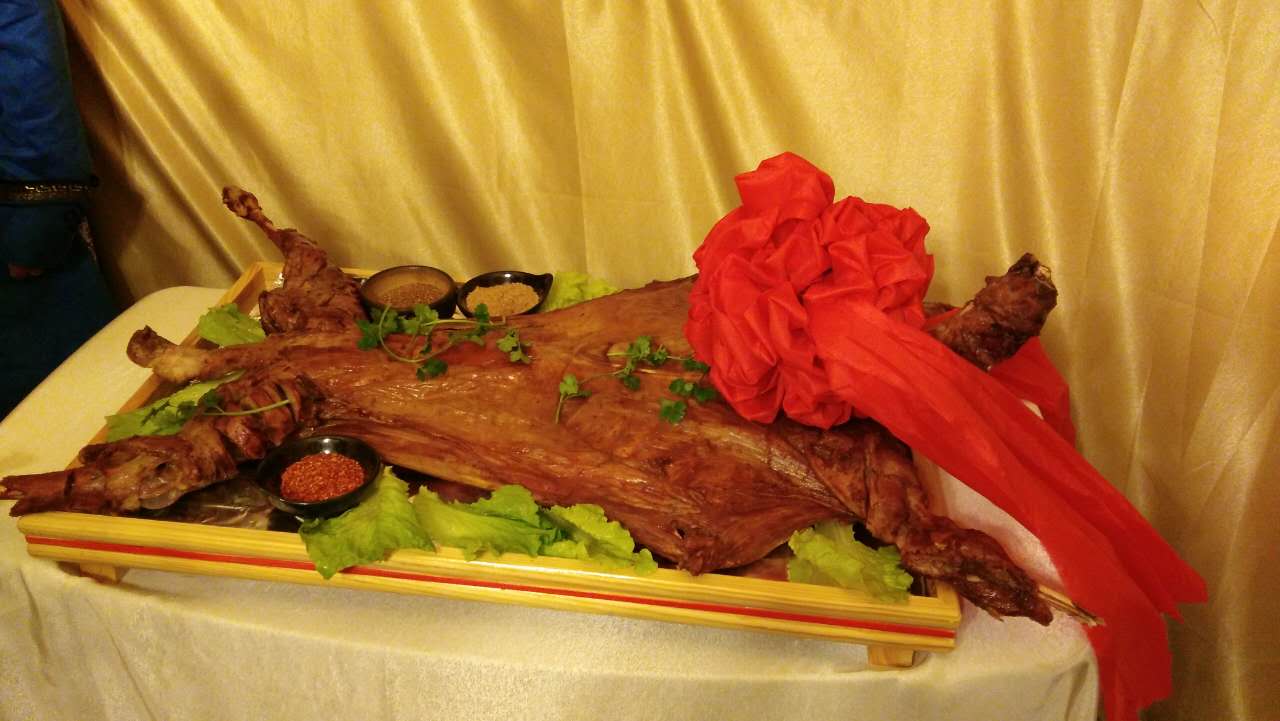 只一道烤全羊,酒店大廚都頗費(fèi)工夫。食材精選肉質(zhì)鮮嫩的鮮羊,肉質(zhì)均勻。因?yàn)閷?duì)“原汁原味”的極致追求,整只羊需提前三個(gè)小時(shí)炭火慢慢烤制。烤全羊上席后,色澤金黃,表皮脆嫩,鮮香襲人,令人垂涎欲滴。此時(shí),酒店工作人員會(huì)為當(dāng)晚最尊貴的客人獻(xiàn)上哈達(dá),并邀請(qǐng)客人一起舉行“開羊儀式”,在蒙古,這象征主人對(duì)朋友最誠摯的祝福。
