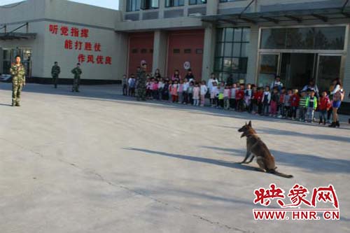 在老師和消防隊員的帶領下,孩子們有秩序地參觀。首先參觀了一樓車庫,孩子們被消防車以及車上的先進裝備深深吸引,消防員叔叔耐心細致地為孩子們講解消防車上的小秘密:高壓水槍、防毒面罩、氧氣瓶、急救箱、云梯、泡沫噴射槍、定位器、呼救器等消防裝備,使孩子們開了眼界。消防隊員還用淺顯的語言向孩子們介紹了消防常識:火災的危害、火災的預防、火災發(fā)生時的逃生自救、消防器械的使用、消防服的穿戴等等。接著孩子們參觀了二樓的消防員宿舍、圖書室、會議室、體育活動室等,更深入地了解了消防員的學習生活,更加走近消防員。最后,消防員為孩子們帶來了精彩的警犬搜救表演,孩子們興高采烈,不約而同為消防員叔叔鼓掌叫好!