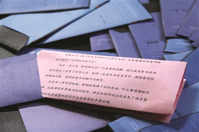 而最棘手則是一些父母與孩子之間有一些矛盾,“我們班一個男生因為高中時候爸媽管他管得太緊,以至于跟他們之間產(chǎn)生了很大的矛盾,他的父母知道有這樣一個可以給孩子寫信的機會之后,雖然很高興,但是也憂心忡忡,害怕孩子不愿意看他們的信,或者會因為這封信措辭不合適而加深對他們的誤解。我開導了他們很久,他們才愿意寫一封信,希望可以解開這個心結(jié)?!标惱蠋煴硎?,這位同學的父母寫的信更像是一封和解信,在字里行間的深深愧疚中,她也感受到了家長對于孩子的無奈和那一顆期望孩子快樂的心。