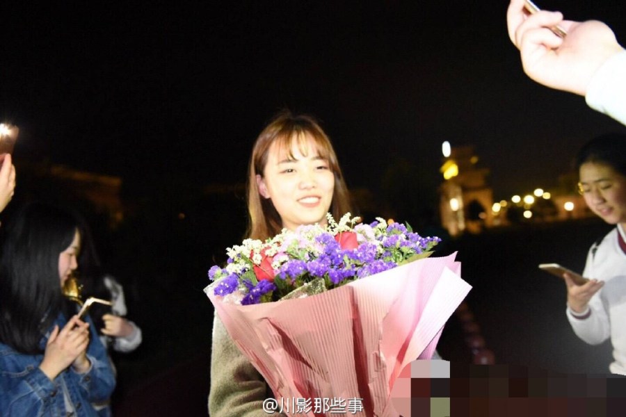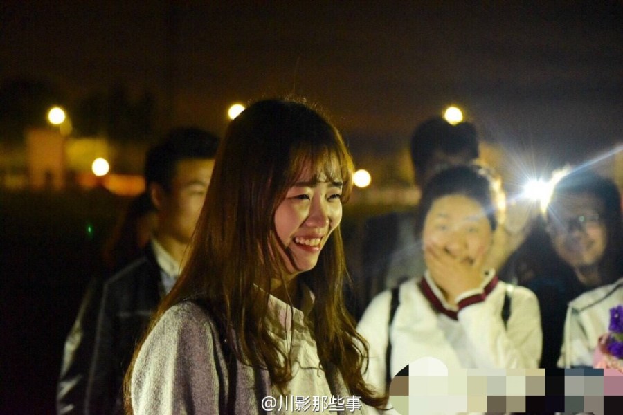 這不是求婚!4月6日晚,四川電影電視學(xué)院操場上川影2015級編導(dǎo)六班的同學(xué)們給美女輔導(dǎo)員過生日,全班男生單膝跪地唱《小幸運(yùn)》。