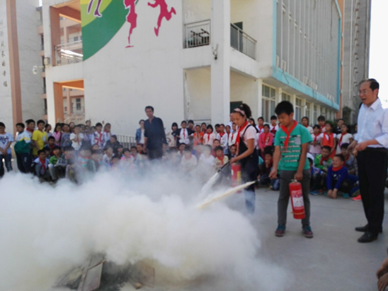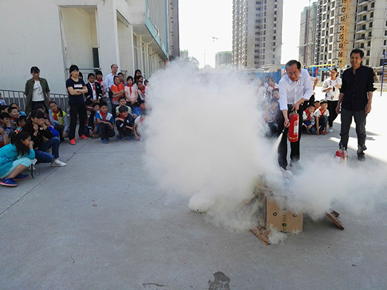 安全疏散演練完畢后,學(xué)校安全員為孩子們講解了校園防火、使用滅火器知識(shí),以及火場(chǎng)逃生自救方法等消防安全常識(shí),并現(xiàn)場(chǎng)指導(dǎo)師生干粉滅火器的使用方法。各班選出學(xué)生代表以及部分教師用滅火器進(jìn)行了現(xiàn)場(chǎng)滅火,參與活動(dòng)的師生嚴(yán)格認(rèn)真地按照滅火方法進(jìn)行著操作,燃燒的“火魔”瞬間被“消防員”撲滅,場(chǎng)上觀看的師生報(bào)以熱烈的掌聲。