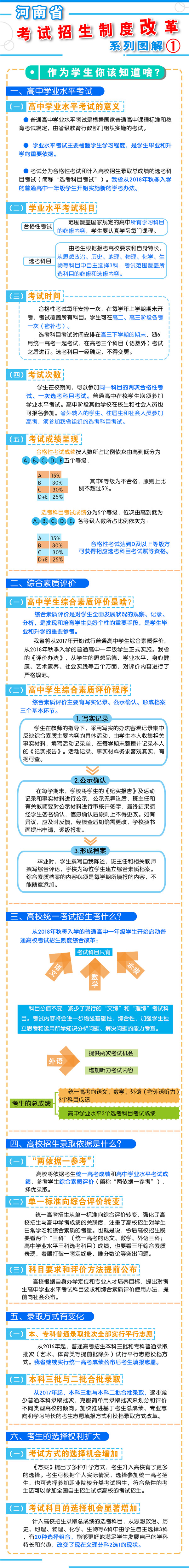 8月23日上午9時,河南省教育廳召開新聞通氣會,通報了《河南省深化考試招生制度改革實施方案》(以下簡稱《方案》)的有關情況?! “凑铡斗桨浮芬?,我省從2018年秋季入學的普通高中一年級學生開始啟動高考綜合改革,考生總成績由統(tǒng)一高考的語、數(shù)、外3科成績和高中學業(yè)水平3個選考科目成績組成。招生錄取實行基于統(tǒng)一高考成績和高中學業(yè)水平考試成績、參考學生綜合素質評價擇優(yōu)錄取機制?! ?strong>總體目標 到2020年,初步形成分類考試、綜合評價、多元錄取的考試招生模式,進一步健全促進公平、科學選才、監(jiān)督有力的體制機制,構建順應時代要求、符合教育規(guī)律和河南省情的考試招生制度?! ?strong>主要任務