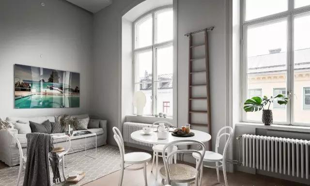 客廳以灰白色為主,大面積的玻璃窗戶(hù)讓室內(nèi)顯得格外明亮通透,沙發(fā)在色調(diào)與圖案上做了變化,豐富了空間層次。墻上的一幅藝術(shù)品在視覺(jué)上給空間升溫,打破過(guò)于沉浸和單調(diào)的感覺(jué)。由于整個(gè)空間格外高挑,墻上懸掛的梯子不僅起了裝飾作用,也是日常必備工具。
