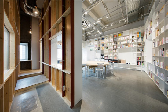 這個(gè)建筑工作室通過(guò)創(chuàng)建一個(gè)既包括圖書(shū)館,另外還有一個(gè)蛋糕店的空間來(lái)完成人們輕松聚集在一起這個(gè)愿望。看似毫不相關(guān)的兩個(gè)空間,只要提供了一個(gè)聚集區(qū),就形成了一個(gè)互動(dòng),兩者就聯(lián)系在了一起。