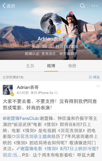 那么,《情劍》的兩位“主演”謝霆鋒與鐘欣桐為什么沒(méi)來(lái)宣傳本片呢?馬云對(duì)此表示:“兩位演員都還有別的戲要拍,沒(méi)時(shí)間來(lái)宣傳我們的電影?!钡皫兹崭勖絾?wèn)及了兩人的經(jīng)紀(jì)人霍汶希,對(duì)方稱(chēng)《情劍》片方根本沒(méi)有通知他們上映的事,更沒(méi)有邀請(qǐng)二人宣傳。而在微博上認(rèn)證為“香港演員、謝霆鋒助手”的網(wǎng)友“Adrian表哥”也發(fā)微博指責(zé)片方并沒(méi)有得到謝霆鋒的同意,是奸商行為。另外,記者也查閱了《情劍》的官方微博,該官微在開(kāi)辦至今僅發(fā)7條微博,有90個(gè)粉絲??梢哉f(shuō),《情劍》除了一組有“抄襲嫌疑”的海報(bào)之外幾乎是在沒(méi)有任何宣傳的情況下推進(jìn)院線的。