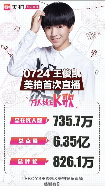 “大哥”王俊凱作為TFBOYS的隊長及團隊核心,一直備受90后乃至00后粉絲追捧。7月24日下午5點王俊凱開啟了在美拍的個人直播首秀,與“小螃蟹”們進行了長達五十分鐘“嗨歌模式”。直播開始正式開始后,觀眾突破六百萬,點贊數(shù)超過五億,而總評論數(shù)更是達到了驚人的826萬,毫無疑問成為全網(wǎng)互動數(shù)最高的直播,同時更輕松登上微博微博熱門話題榜單,收獲1.5億閱讀量。