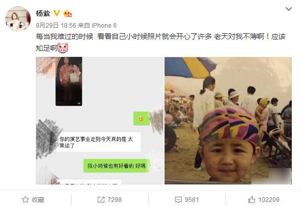 9月29日,楊紫曬出兩張照片,一張為聊天的截圖,一張為楊紫小時候的照片,楊紫寫道:“每當(dāng)我難過的時候,看看自己小時候照片就會開心了許多。老天對我不薄?。?yīng)該知足啊?!?/p>