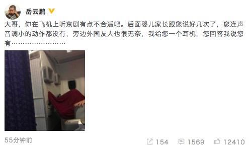 3月7日晚,岳云鵬通過微博譴責飛機上不文明現(xiàn)象,寫道:“大哥,你在飛機上聽京劇有點不合適吧。后面嬰兒家長跟您說好幾次了,您連聲音調(diào)小的動作都沒有,旁邊外國友人也很無奈,我給您一個耳機,您回答我說您有……”