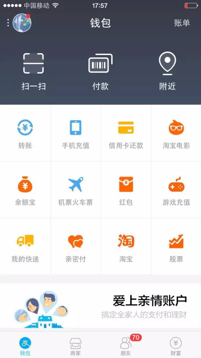 新版支付寶還內(nèi)嵌了淘點點,也就是說,上支付寶也能點外賣了。還有什么飛機(jī)票啦、火車票啦,統(tǒng)統(tǒng)可以在上面買。