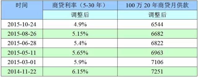 以去年最后的利息調(diào)整日期(2014年11月22日)計(jì)算,你2016年負(fù)擔(dān)的利率一下子從2015年的6.15%下降到4.9%。今年央行利率5連降,100萬20年商業(yè)貸款的月供每次約減少150元左右。明年的月供款從7251元下降至6544元,每月節(jié)省707元!