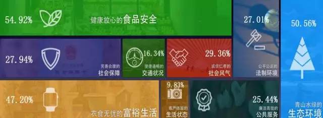 重視“舌尖上的安全”,提到“全面小康社會(huì)”最期待的圖景,“健康放心的食品安全”(54.92%)最被百姓看重。其次,山青水綠的生態(tài)環(huán)境(50.56%)和衣食無(wú)憂的富裕生活(47.20%)也很重要。