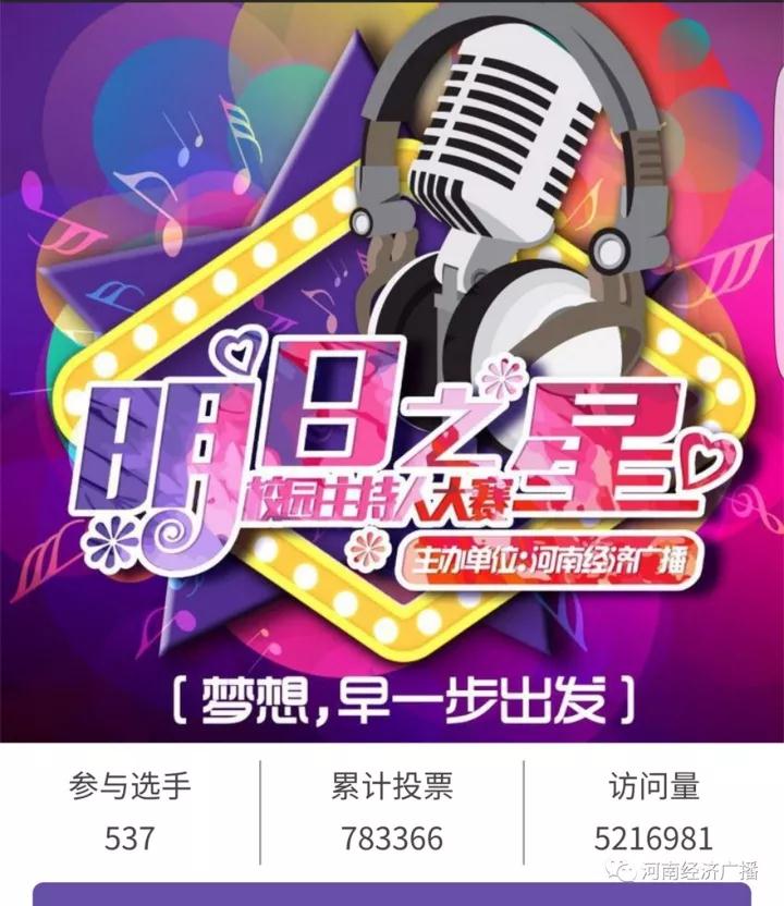 河南經濟廣播·第三屆“明日之星”校園主持人大賽備受矚目,微信投票更是達到了五百二十一萬的訪問量!經過鄭州、安陽、南陽、三門峽、駐馬店、洛陽、開封、新鄉(xiāng)、商丘、林州、漯河、新鄭,十二個賽區(qū)十四個賽點,二千六百余人的激烈角逐;再到決賽時選手的精彩表現。一路走來,有驚喜、有歡樂、有學習、有思考。