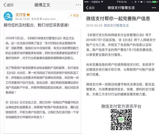 22日,支付寶官方微博發(fā)表聲明稱,“支付寶將在《辦法》出臺后正式啟動相關系統(tǒng)升級與改造工作,并且?guī)椭脩暨M行相關操作?!?5日中午,微信支付在其官方賬號“微信支付智慧生活”發(fā)布了題為《微信支付幫你一起完善賬戶信息》的短文。