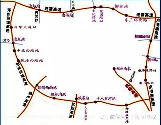 ?。ㄒ唬┮画h(huán):鄭州繞城高速公路(由京港澳、連霍、鄭少、鄭民等四條高速公路相連成為鄭州外環(huán));
