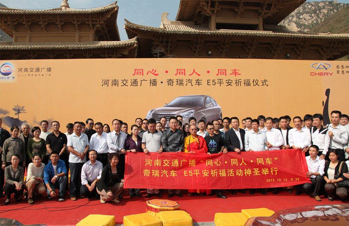 公元2012年10月13日(農(nóng)歷八月二十八)9:36正點(diǎn)時(shí)刻,河南交通廣播“同心?同人?同車—奇瑞汽車 E5平安”祈福活動神圣舉行。河南交通廣播為了讓本次祈福活動氣氛更好,在更大范圍內(nèi)傳播、弘揚(yáng)禪宗之精神。特把本次活動的主要儀式設(shè)置禪文化氛圍濃郁的“禪宗少林·音樂大典”內(nèi)神圣舉行。