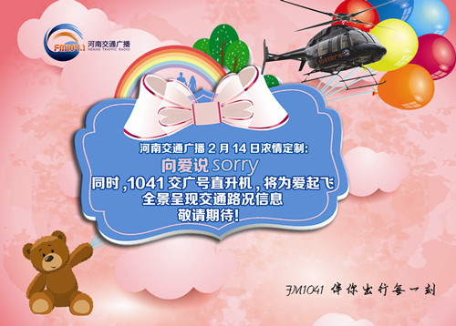 2月14日當(dāng)天,1041交廣號直升機(jī)也將再次為愛起飛,在全景呈現(xiàn)路況信息的同時,為您提供情人節(jié)私人定制飛行。如果你足夠幸運(yùn),將有機(jī)會坐上1041交廣號直升機(jī),和你的那個Ta獨享二人世界,遨游藍(lán)天、一起俯瞰鄭州美景。