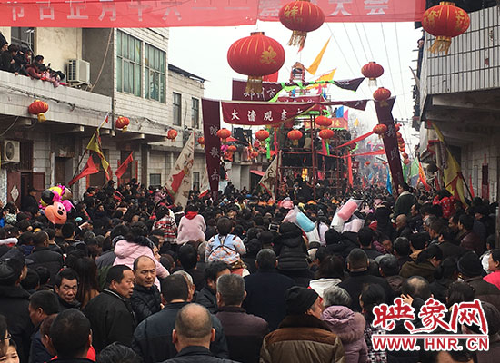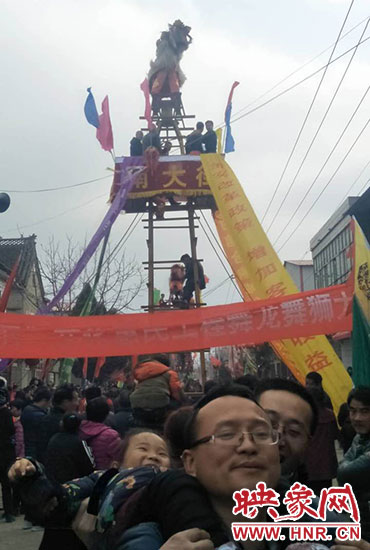 新鄭市觀音寺鎮(zhèn)太清村,新鄭、長葛、禹州的三縣交界處。3月3日下午15時(shí)許,太清村的街上人山人海,水泄不通。各條街道上鑼鼓喧天,熱鬧非凡。多個(gè)舞獅團(tuán)隊(duì)開始在高高樹起的架子上表演,地面上各種各樣的民間表演爭奇斗艷。
