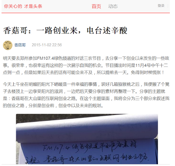 自媒體,以“香菇哥”的名義在各個自媒體平臺申請入駐,最先申請的是搜狐媒體平臺,運作的這幾個月,搜狐上的累計閱讀量目前已達到16萬。后來又申請了今日頭條,一點咨詢,鳳凰新聞媒體平臺等渠道。也建立了自己的微信公眾號。目前所有的宣傳渠道的累計閱讀量已經(jīng)突破了七十萬。就是在這些渠道上宣傳自己的創(chuàng)業(yè)故事以及大山里面的人文風(fēng)情來傳播。
