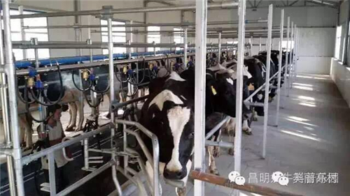 產(chǎn)奶期的奶牛從自己的牛舍成群結(jié)隊(duì)的有序步入擠奶廳,進(jìn)入擠奶廳后,每只奶牛都要先洗澡,然后人工擠掉前三把牛奶,裝好擠奶器,牛奶就從奶牛的體內(nèi)經(jīng)管道直接進(jìn)入冷藏罐了。我們可以站在觀景平臺(tái)上,透過高清玻璃,可以清楚的看到擠奶廳內(nèi)奶牛排隊(duì)擠奶的壯觀場(chǎng)景。