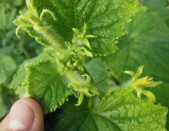 當氣溫降低后,尤其是伴隨雨雪天氣發(fā)生時,由于太陽光輻射減少會導致地溫降低,這樣一來植物的地上組織和地下根系的呼吸作用都會下降,呼吸下降后生理代謝就會緩慢,植物吸收肥水的能力就會減弱,如果此時作物正處于苗期則易出現(xiàn)僵苗的現(xiàn)象;如果處于開花座果期,則常常表現(xiàn)為各種生理性病害的發(fā)生,如花打頂。這種癥狀在黃瓜等瓜類蔬菜上最為常見,即植株的生長點積在大量雌花或小瓜,植株停止生長。花打頂?shù)某霈F(xiàn)是由于低溫促使了花芽過度分化,雌花數(shù)量增加,而植株缺乏足夠的養(yǎng)分供其生長,蔓不能伸長,造成雌花生在在植株的頂端。