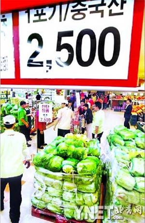 進(jìn)入10月以來,作為韓國的“國菜”泡菜用的原料大白菜價(jià)格出現(xiàn)了暴漲的情況。在首爾,超市里一棵白菜的價(jià)格一度達(dá)到了1.5萬韓元(約合人民幣89元)。為了平抑菜價(jià),韓國政府緊急從中國進(jìn)口免關(guān)稅的大白菜救急。記者昨日在韓國首爾的樂天連鎖超市了解到,在每人限購3棵的情況下,中國大白菜在開業(yè)后30分鐘左右就已售罄,超市已決定從中國追加進(jìn)口10萬棵白菜。