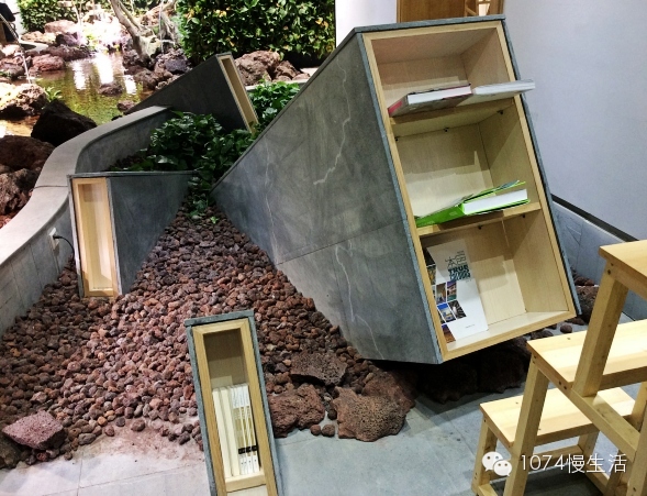 書架間隙,大片的綠色植被,墻上全都是鮮活的植物,目之所及,除了書,就是綠色。