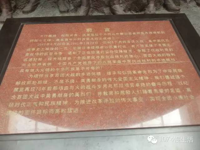 紀(jì)念抗日戰(zhàn)爭暨世界反法西斯戰(zhàn)爭勝利70周年追隨先輩足跡,唱響時(shí)代凱歌——紀(jì)念抗日戰(zhàn)爭暨世界反法西斯戰(zhàn)爭勝利70周年晉冀魯豫記者大型聯(lián)合采訪活動(dòng)《回聲》拉開大幕前方報(bào)道晉冀魯豫四省聯(lián)和采訪團(tuán)的第二站來到了山西陽泉縣獅腦山百團(tuán)大戰(zhàn)紀(jì)念館,百團(tuán)大戰(zhàn)是中國抗日戰(zhàn)爭時(shí)期,中國共產(chǎn)黨領(lǐng)導(dǎo)下的八路軍、新四軍與日軍在中國華北地區(qū)晉察冀邊區(qū)發(fā)生的一次規(guī)模最大、持續(xù)時(shí)間最長的戰(zhàn)役。