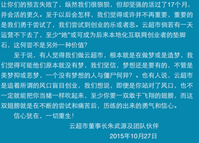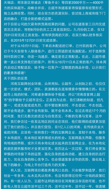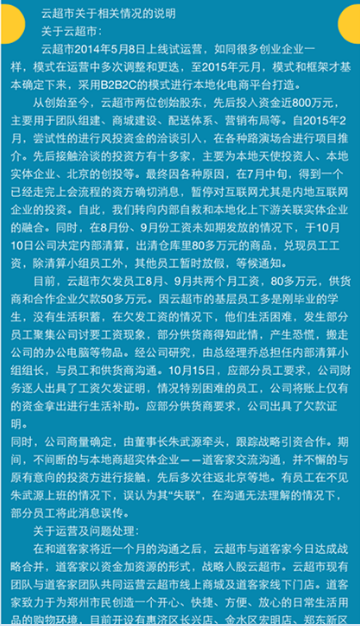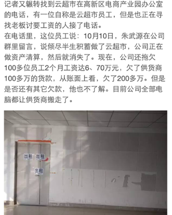 最近一周,在鄭州電商圈悄悄地流傳著這個消息……云超市倒閉了?董事長朱武源失聯(lián)了?讓我們看一下26號各媒體發(fā)出的消息: